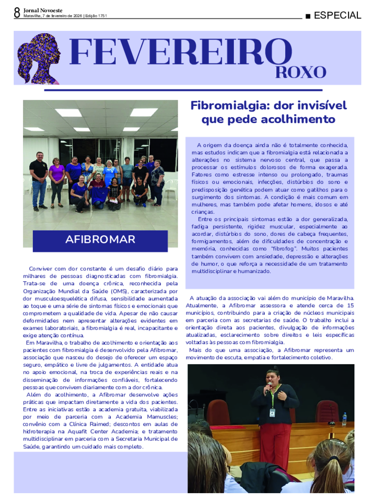 Em Maravilha, o trabalho de acolhimento e orientação aos pacientes com fibromialgia é desenvolvido pela Afibromar, associação que nasceu do desejo de oferecer um espaço seguro, empático e livre de julgamentos. A entidade atua no apoio emocional, na troca de experiências reais e na disseminação de informações confiáveis, fortalecendo pessoas que convivem diariamente com a dor crônica.